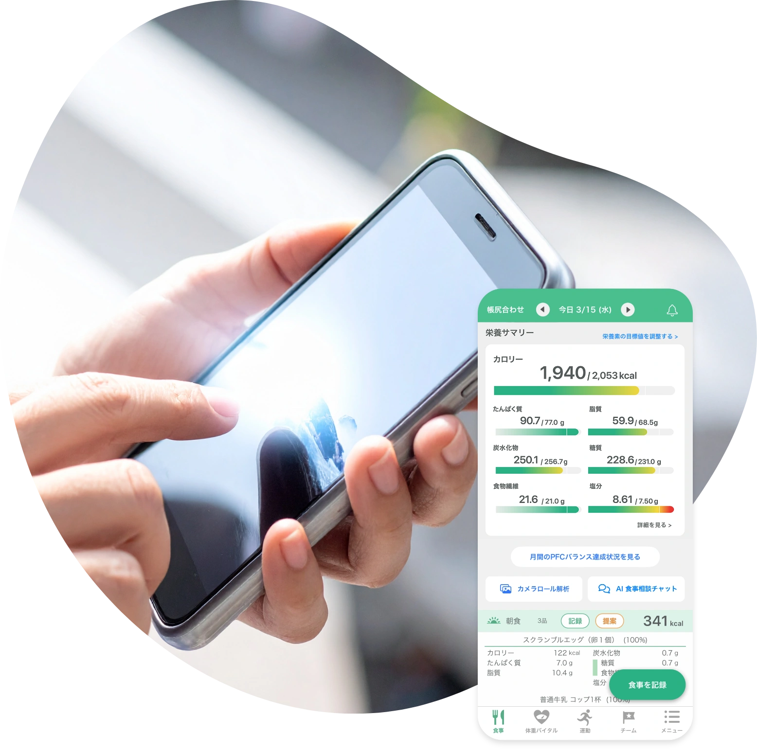 AI搭載アプリ「カロミル」と連携し、対象者のライフログデータ(食事・体重・運動)を解析。