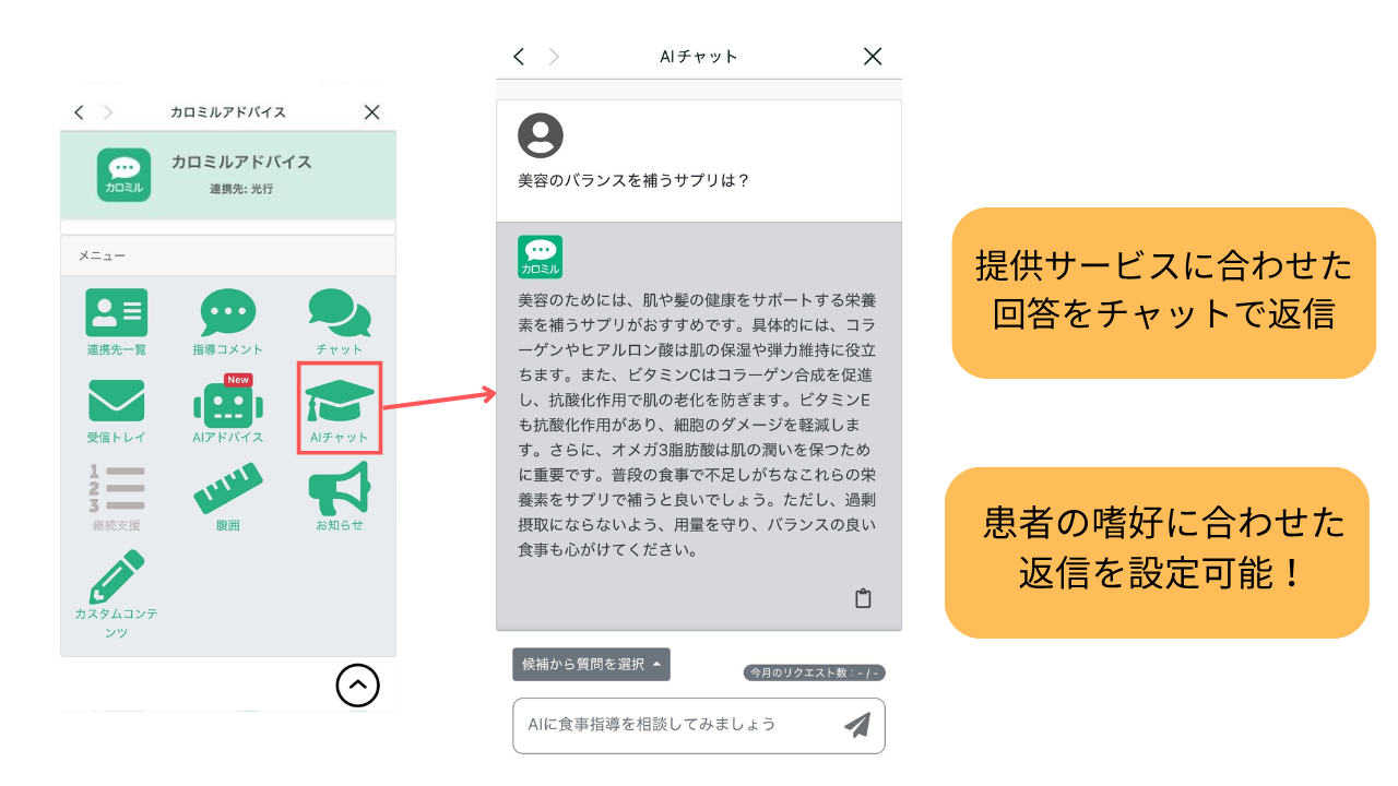 食事・運動・体重管理アプリケーション(以下アプリ)「カロミル」の開発・提供をするライフログテクノロジー株式会社(東京都中央区、代表取締役:棚橋繁行、以下当社)は、栄養指導ツール「カロミルアドバイス」において、生成AIを活用した「AIアドバイス」「AIアドバイスチャット」を導入企業ごと、指導対象者ごとにカスタマイズし提供する機能をリリースしました。本機能により、AIとの双方向コミュニケーションや自動アドバイスを導入企業ごとに最適化し、よりパーソナライズされたサポートを提供します。