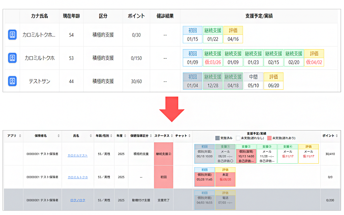 支援終了はグレー、支援が遅れている受診者は赤など、支援状況を色分けで可視化し、受診者からの連絡状況なども一覧で確認できる機能です。支援担当者・保険者・面談時期などで絞り込みが可能で、Excel等での別ソフトでの進捗管理が不要になりました。